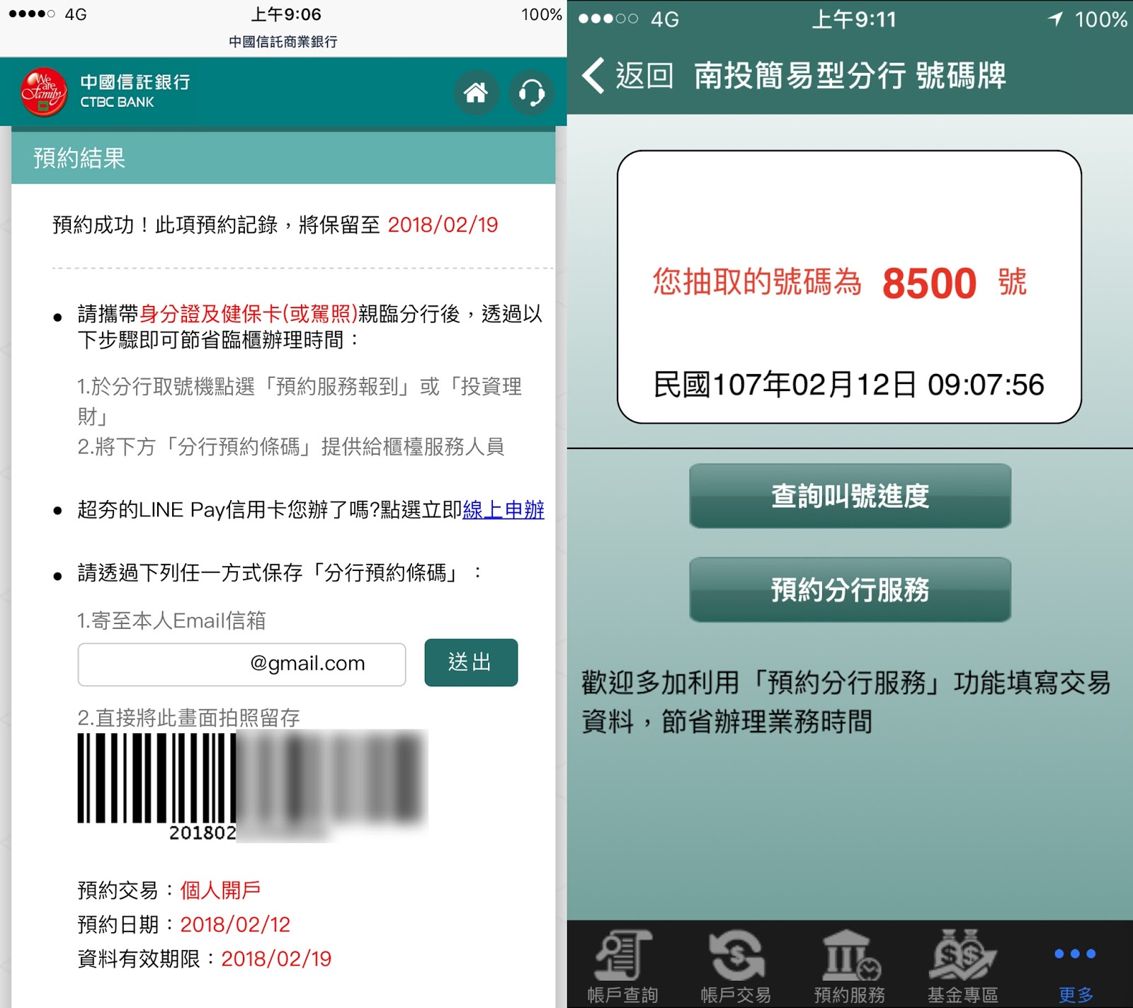 之後那位女服務員協助我下載了「中信行動達人 app」並在 app 上預約,然後收走了我的號碼牌。